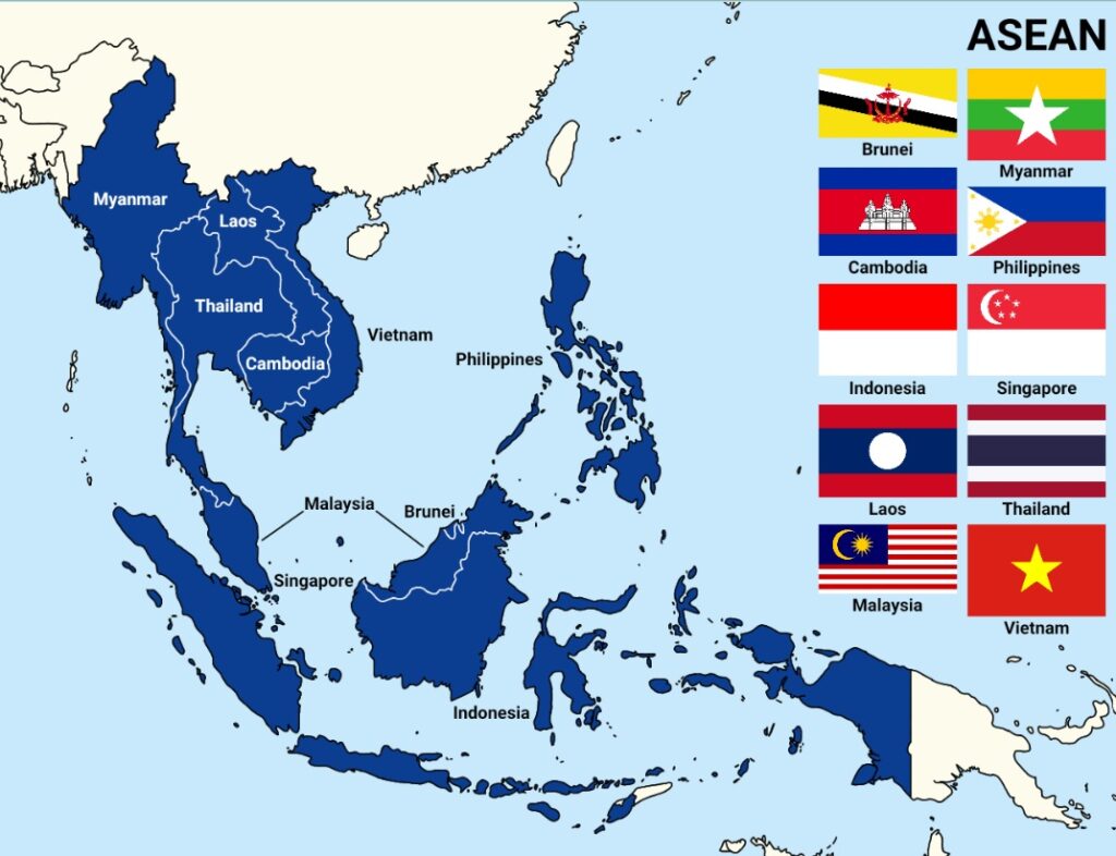 The Association of Southeast Asian Nations (ASEAN) (ASEAN) comprises eleven member countries: Brunei, Cambodia, Indonesia, Laos, Malaysia, Myanmar (Burma), the Philippines, Singapore, Thailand, Timor-Leste and Vietnam.